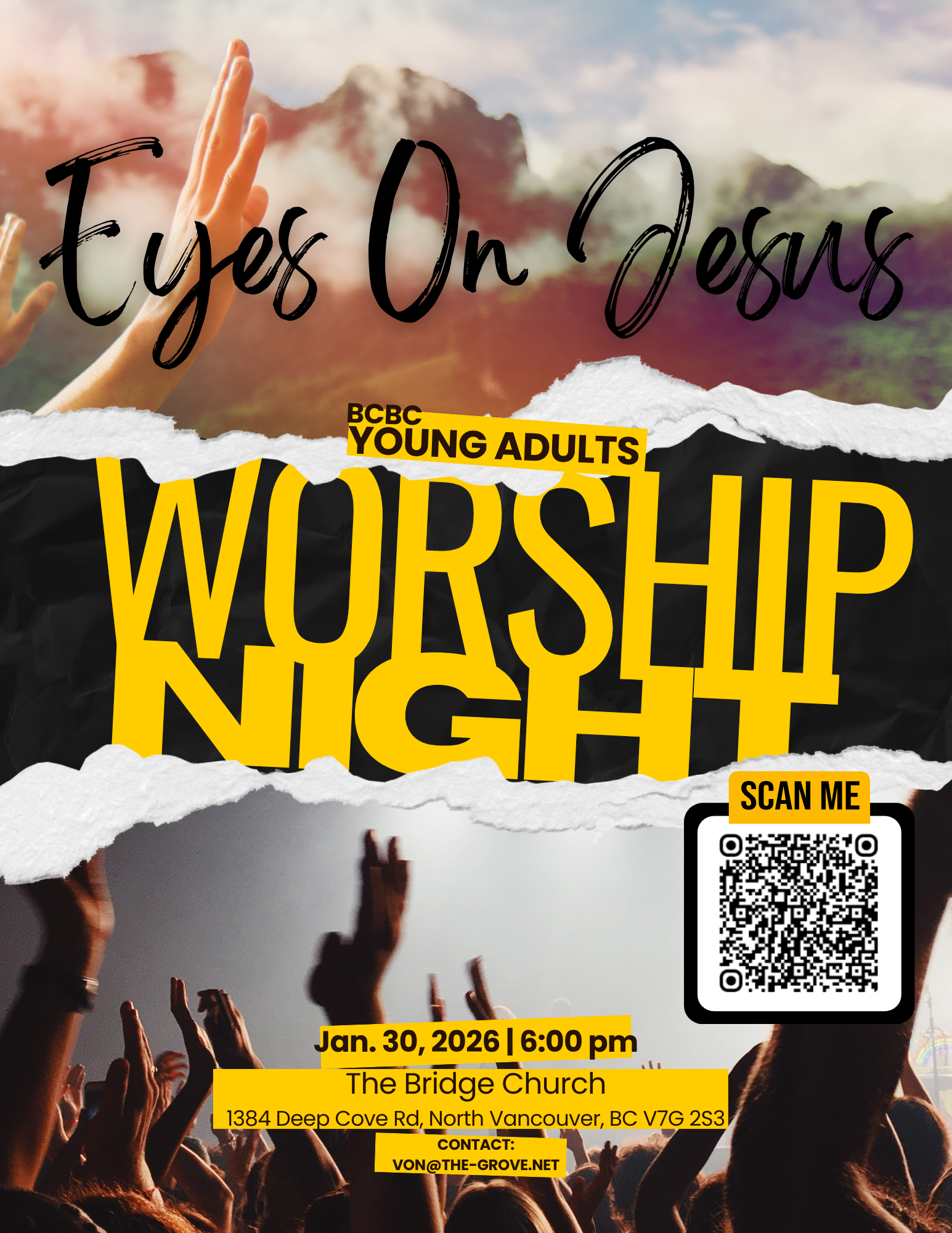 We invite you to a Night of Worship along with the young adults across Metro Vancouver Mainland. There will be fellowship, prayer, singing, even games, and a time to learn from the Living Word of God. It is a great opportunity to meet with the different young adult groups from other places & local churches, and encounter Jesus within His community as we fix our EYES ON JESUS.